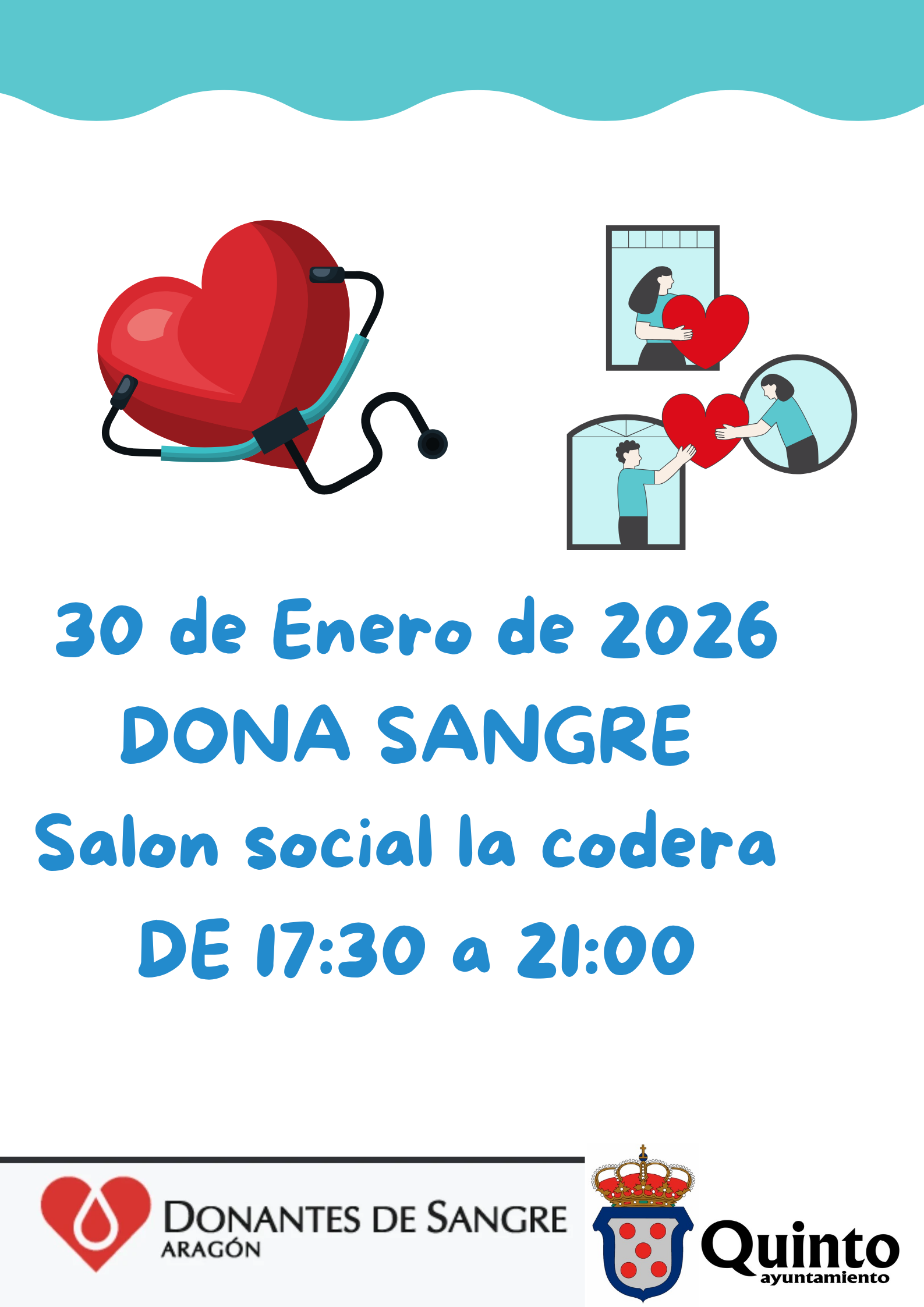 Los Donantes de Sangre comunican que el día 30 de enero estarán en La Codera, en horario de 17:30 a 21:00 horas, para la realización de extracciones de sangre.