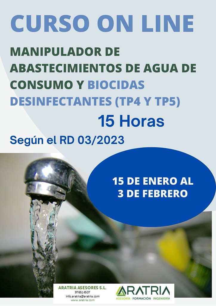 Aratria Asesores ofrece un curso on-line de Manipulador de Aguas de Consumo y Desinfectantes TP4 y TP5. Del 15 de enero al 3 de febrero. Acceso a la plataforma las 24 horas del día. Contacto: 976 51 45 07 ó info.aratria@aratria.com
