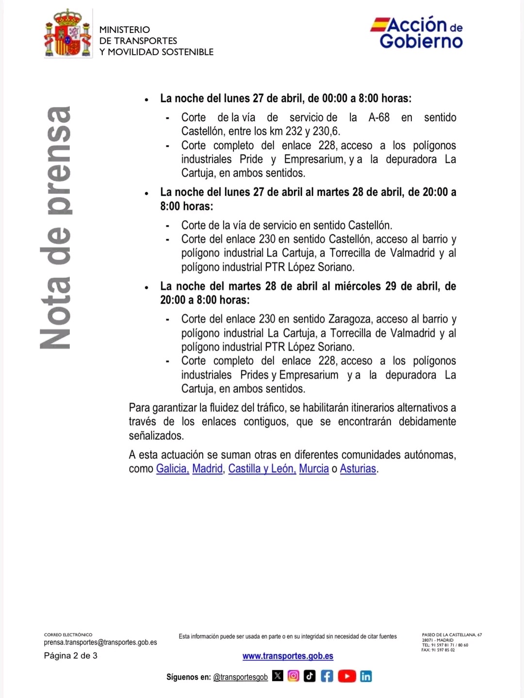 Compartimos la información que llega desde el Ministerio para que los usuarios de esta vía sean conocedores de las posibles afecciones.