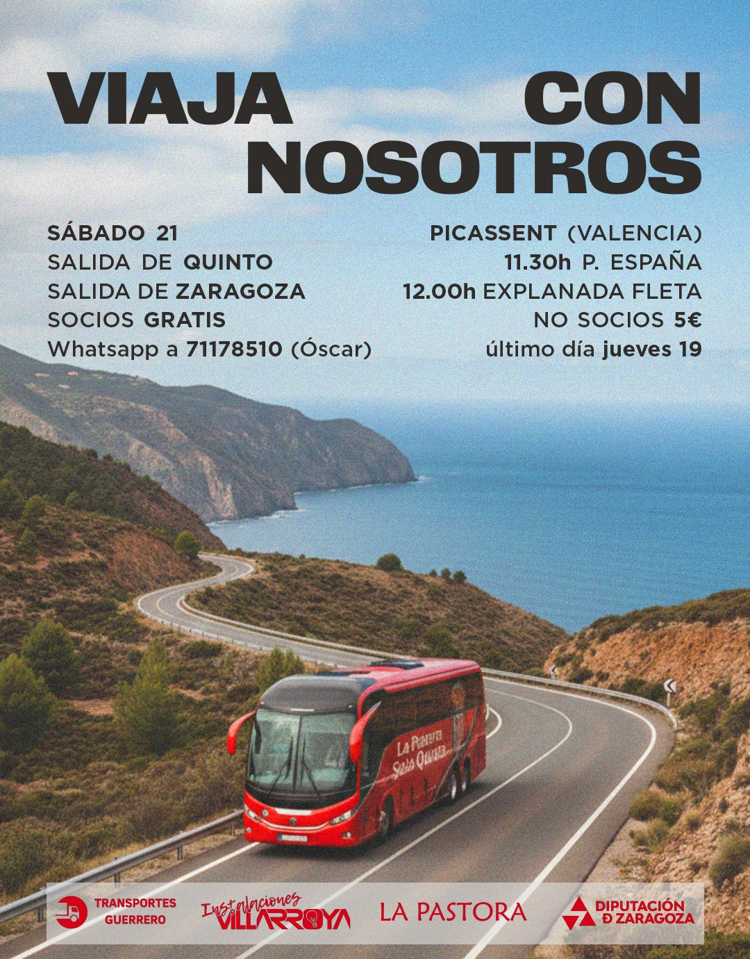 El sala Quinto informa que va a poner un autobús gratuito para los aficionados que quieran viajar junto al equipo a Picassent (Valencia) para este sábado 21 de febrero. La hora de salida será a las 11.30h desde la parada de la plaza y regreso tras el partido.