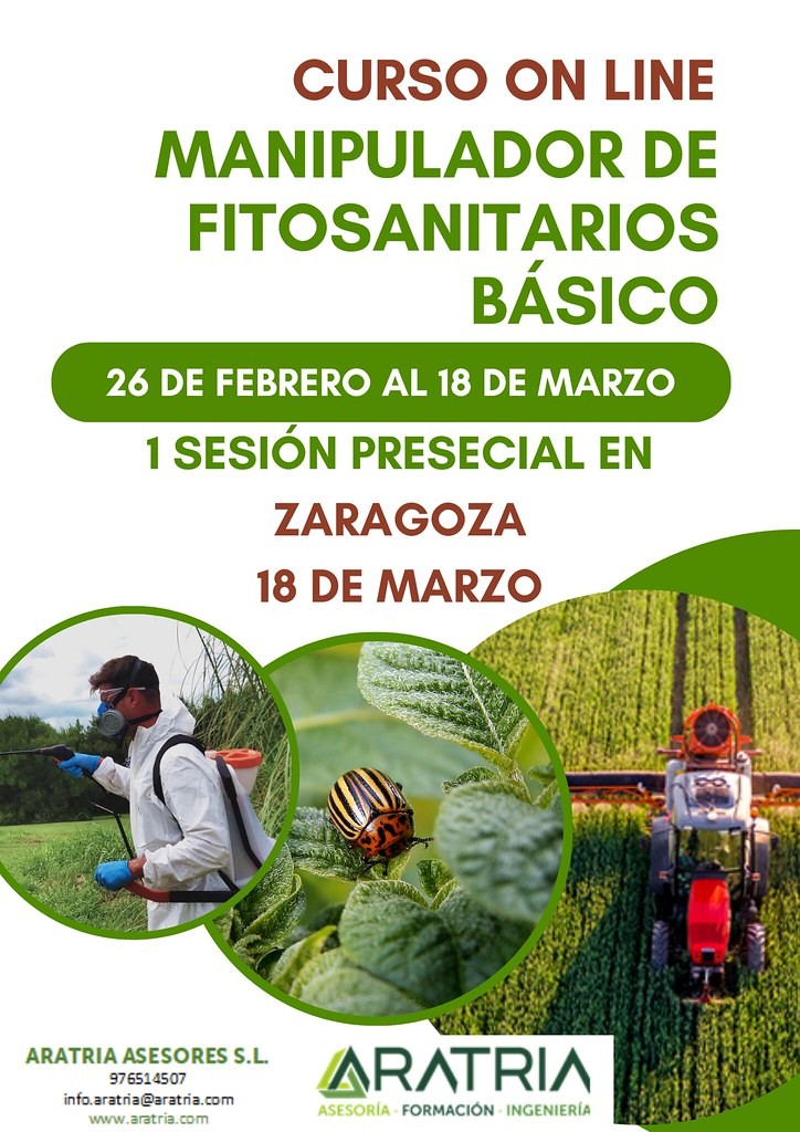 Aratria asesores informa de un curso on-line Manipulador de Fitosanitario Básico, comienza el día 26 de febrero y finaliza el 18 de marzo. Para más información en el teléfono 976 51 45 07, en el correo info.aratria@aratria.com ó página web www.aratria.com