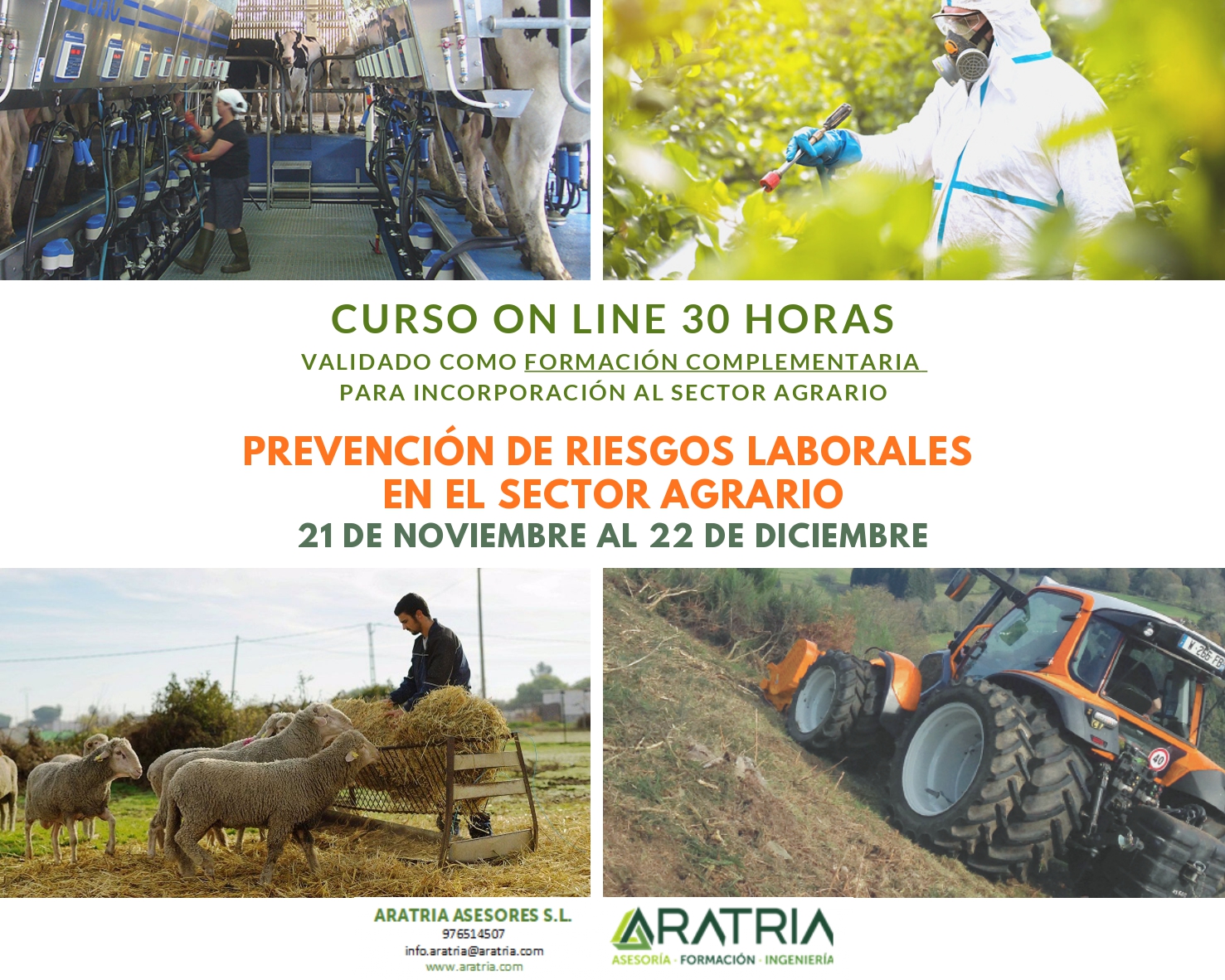 Aratria asesores informa de un curso on-line Prevención de Riesgos Laborales en el Sector Agrario , comienza el día 21 de noviembre y finaliza el 22 de diciembre. Para más información en el teléfono 976 51 45 07, en el correo info.aratria@aratria.com ó página web www.aratria.com