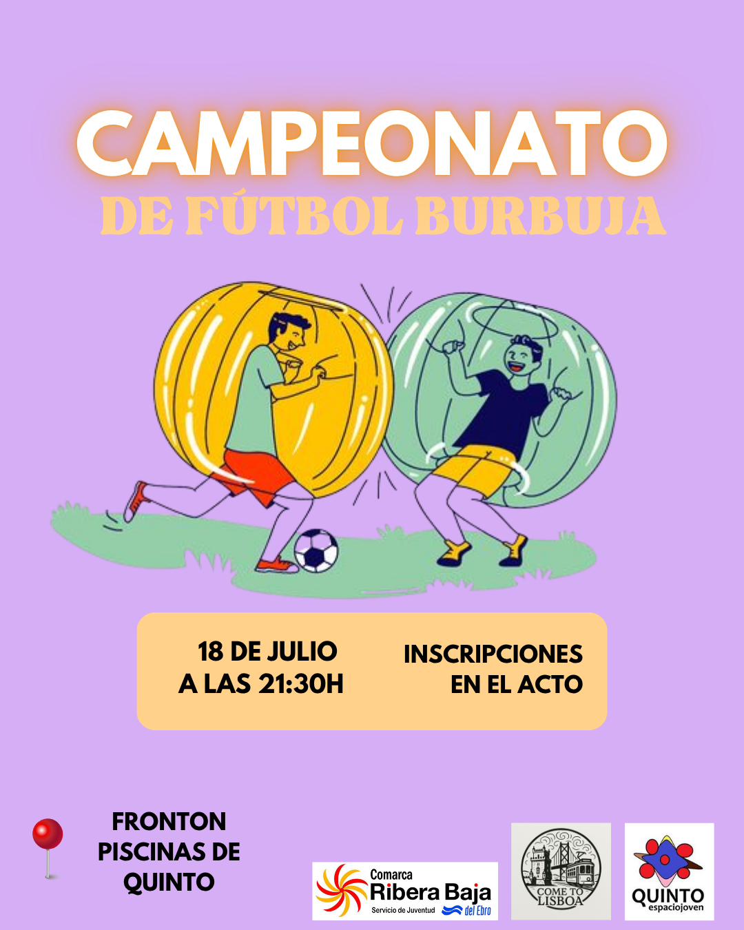 El grupo local Come To Lisboa informa que hoy habrá campeonato de fútbol burbuja en el frontón de las piscinas a las 21:30h. Las inscripciones se realizaran en el acto. Los equipos estarán formados por 4 participantes con edades comprendidas entre 14 y 30 años.