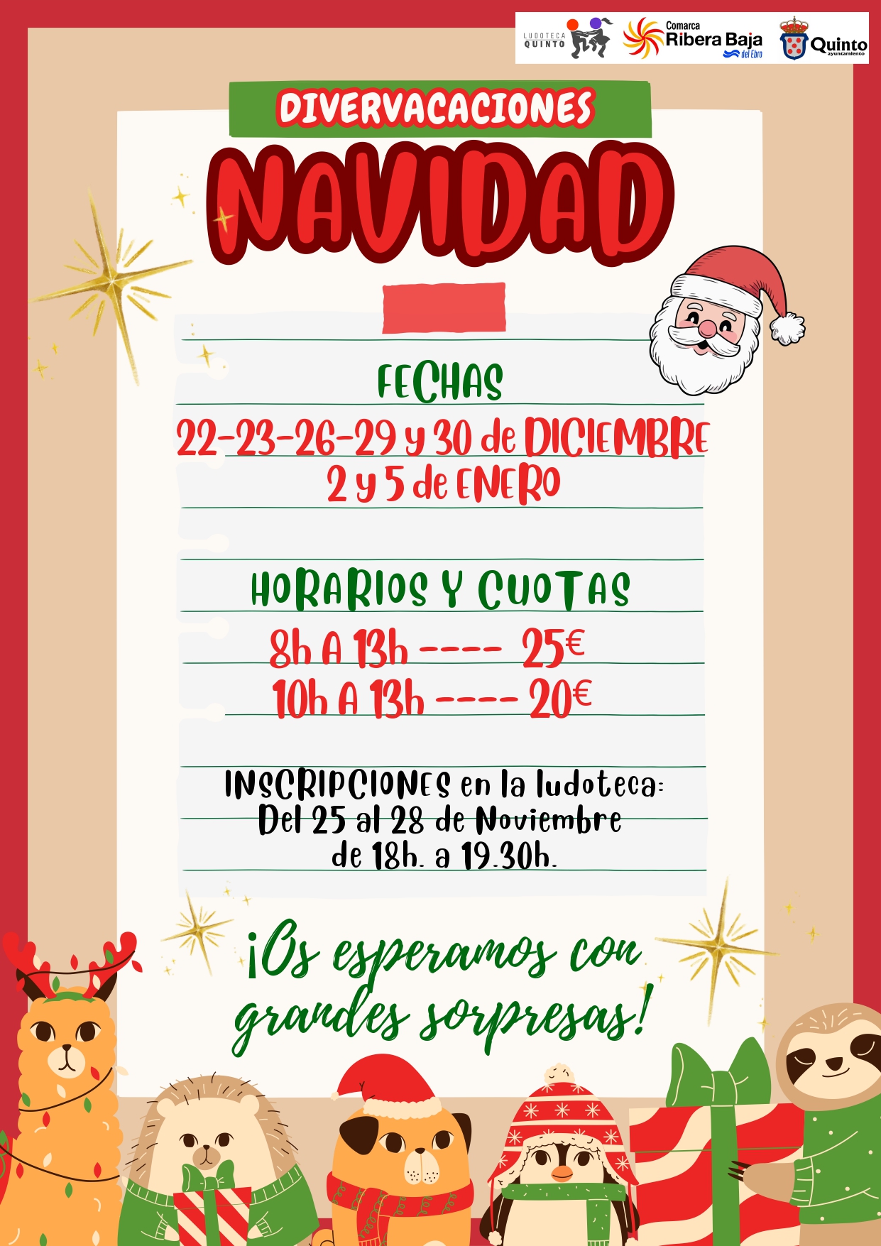 La ludoteca comunica que ofrece el servicio de conciliación “Divervacaciones Navidad” dirigido a niñ@s de Educación Infantil a 1º ESO, los días no lectivos de Navidad y Año Nuevo: 22, 23, 26, 29 y 30 de diciembre y, 2 y 5 de enero.