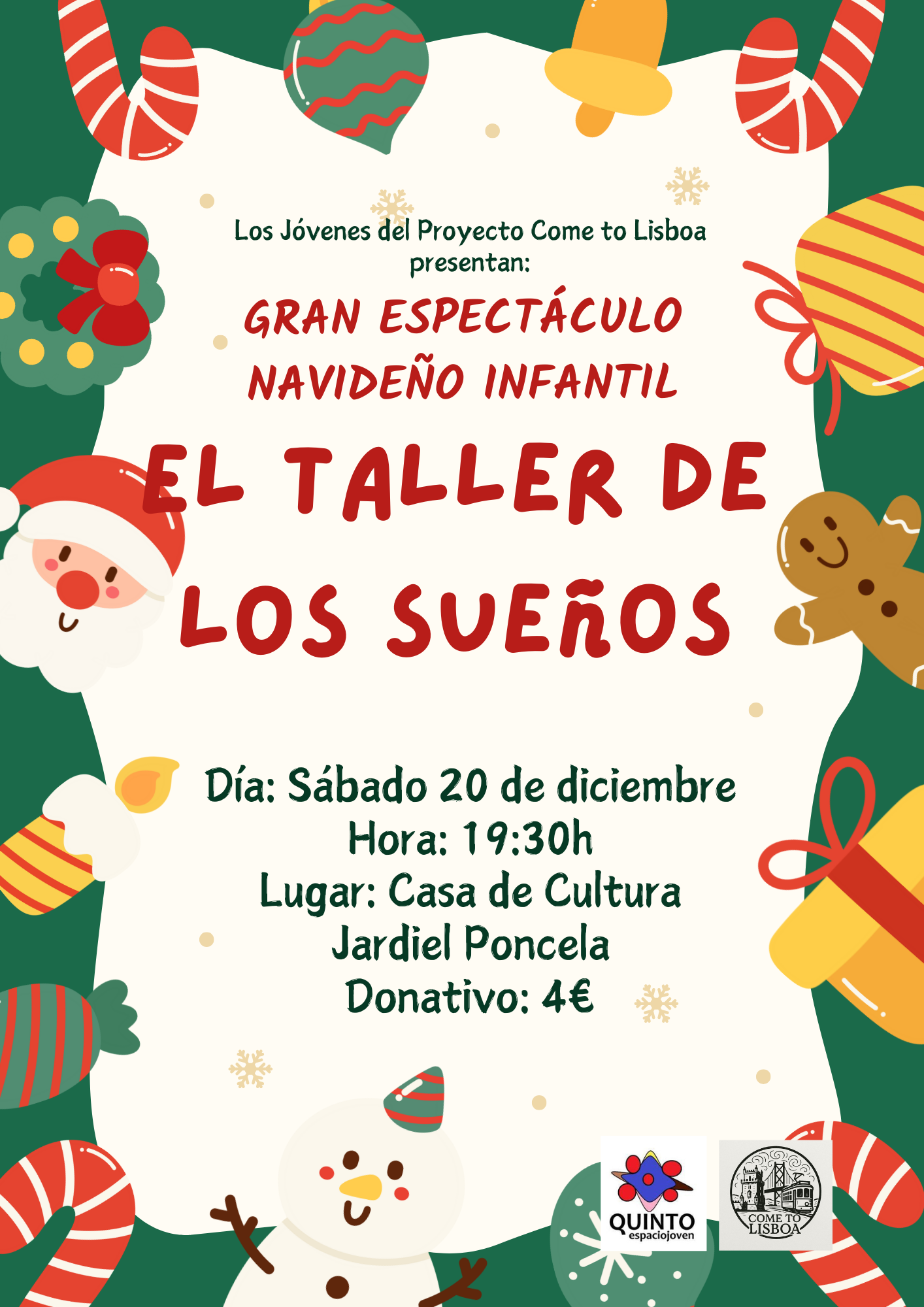 El grupo local Come to Lisboa informa que el sábado 20 de diciembre a las 19:30 horas habrá un espectáculo navideño: "El taller de los deseos" en la Casa de Cultura. La venta de entradas se realizará en el Espacio Joven del 15 de diciembre al 18 de diciembre de 18:00 a 21:00h. Y en la casa de cultura el sábado una hora antes del comienzo de la actuación. El precio de la entrada son 4€.