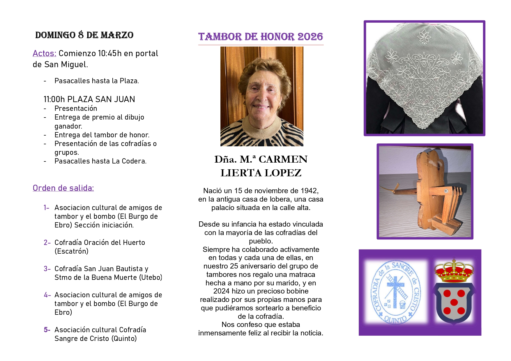 La cofradía de la Sangre de Cristo informa que el encuentro de cofradías y entrega del tambor de honor será este domingo, 8 de marzo, por la mañana. Las cofradías saldrán a las 10.45h en pasacalles desde el Portal de San Miguel hasta la Plaza Vieja, donde tendrá lugar la presentación de las cofradías, entrega del premio al dibujo ganador y entrega del tambor de honor. Al finalizar, las cofradías irán en pasacalles hasta La Codera.