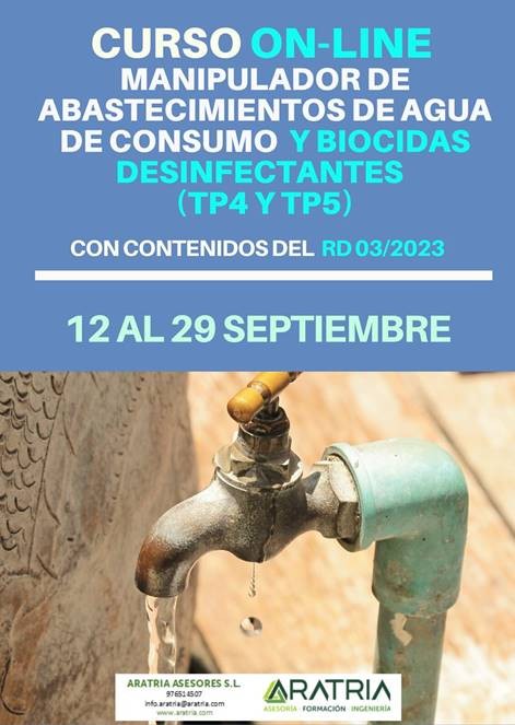 Aratria asesores informa de un curso on-line, Manipulador de Abastecimiento de agua de consumo y productos biocidas desinfectantes. Comienza el día 12 de septiembre y finaliza el 29 de septiembre. Para más información en el teléfono 976 51 45 07, en el correo info.aratria@aratria.com ó página web www.aratria.com