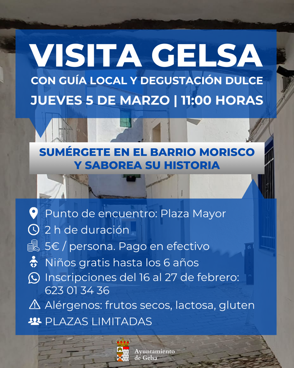 El ayuntamiento de Gelsa informa que el próximo jueves 5 de marzo, a las 11:00 horas, tendrá lugar la actividad “Visita Gelsa”, un recorrido guiado por el barrio morisco con degustación dulce.